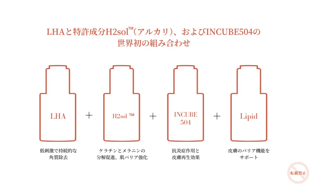 主成分のLHA(リポヒドロキシ酸)とアルカリ成分H2solそして脂質成分Lipidsの3つの成分が、肌の深層まで浸透し、角質を除去しながらも肌を満たし、再生を促進します。