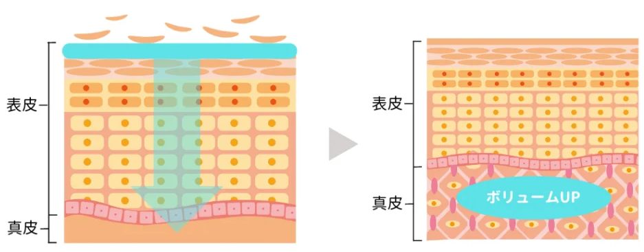 さらに線維芽細胞の活性化によりコラーゲンやエラスチンが再生され皮脂を分厚くする効果もあります。